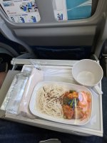 Vorbestellt war telefonisch ein vegetarisches (in dem Fall auch veganes) Essen. Beim Online Check-in ist das auch noch explizit erwähnt worden. An Bord bekamen wir dann bereits vor dem Start diese Karten ausgehändigt, und tatsächlich hatte man dann kein vegetarisches Essen für uns. Für uns war das aber kein Problem, da es nur Fisch war. Das Essen war auch wirklich sehr lecker. Viel besser als das was andere Airlines auf Europaflügen anbieten.