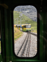 Dann sind wir auch schon am Ende der Runde angekommen, ich stelle fest, dass wir die Sphinx-Aussichtspalttform ausgelassen haben. Also gehen wir nochmal bis dahin und fahren hoch, hier sind wir aber hinter Glas und ich sehe keine Gelegenheit, welche nach draußen führt, was aber auch egal ist, Sicht ist praktisch keine vorhanden. Wieder zurück am Ausgangspunkt wechseln noch zwei Magneten den Besitzer, und schon sitzen wir in einem talabwärts fahrenden Zug.
