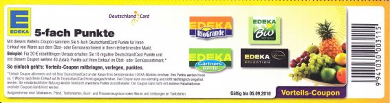Einen 10-fach Coupon für EDEKA für die Obst- und Gemüseabteilung hätte ich auch noch. Aber diesen hat ja wahrscheinlich sowieso jeder per Post erhalten.