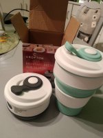 Bei Aldi hab ich letzte Woche solche faltbaren Silikonbecher im 2er-Set für zwei Euro gefunden. Reicht beim Bäcker für einen großen Kaffee und passt überall rein.